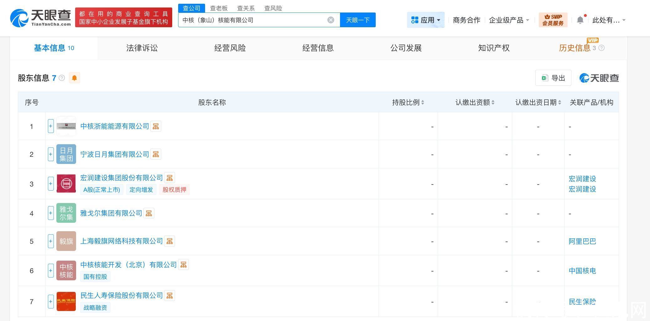 天眼查工商信息显示信德信德,近日,中核(象山)核能有限公司成立,法定代表人为钟华,注册资本2.5亿人民币,经营范围含发电业务、输电业务、供(配)电业务,辐射监测,检验检测服务,热力生产和供应,业务培训,发电技术服务,以自有资金从事投资活动等。股东信息显示,该公司由中国核电旗下中核浙能能源有限公司、宏润建设(002062)、雅戈尔集团有限公司、阿里巴巴旗下上海毅旗网络科技有限公司等共同持股。
